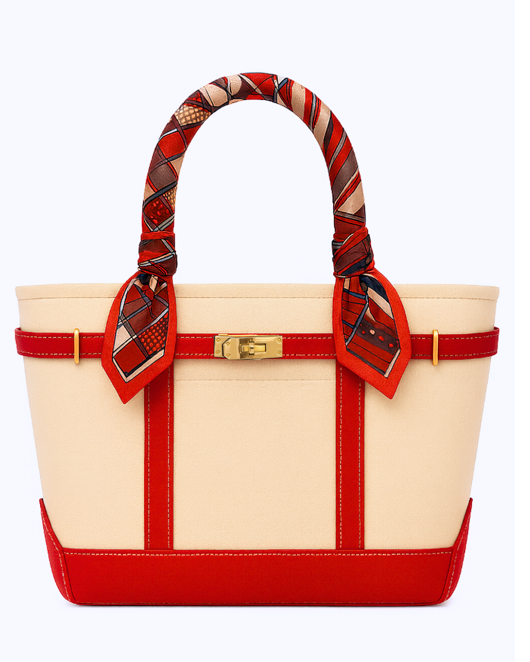 The polished turn-lock shines with a warm, mirror-like finish, striking a perfect balance between elegance and strength. Precision-cut metal hardware secures each tote with effortless ease.