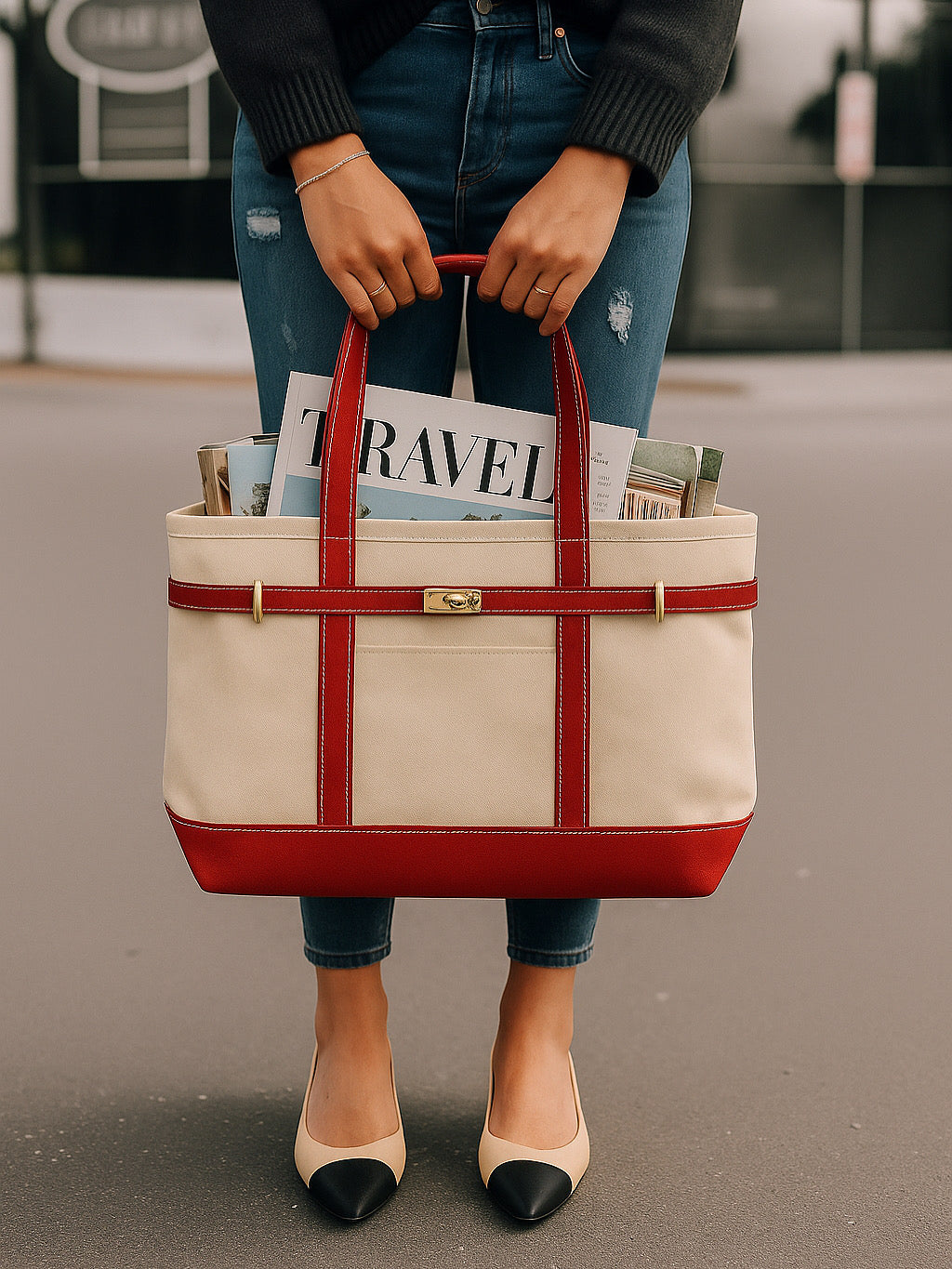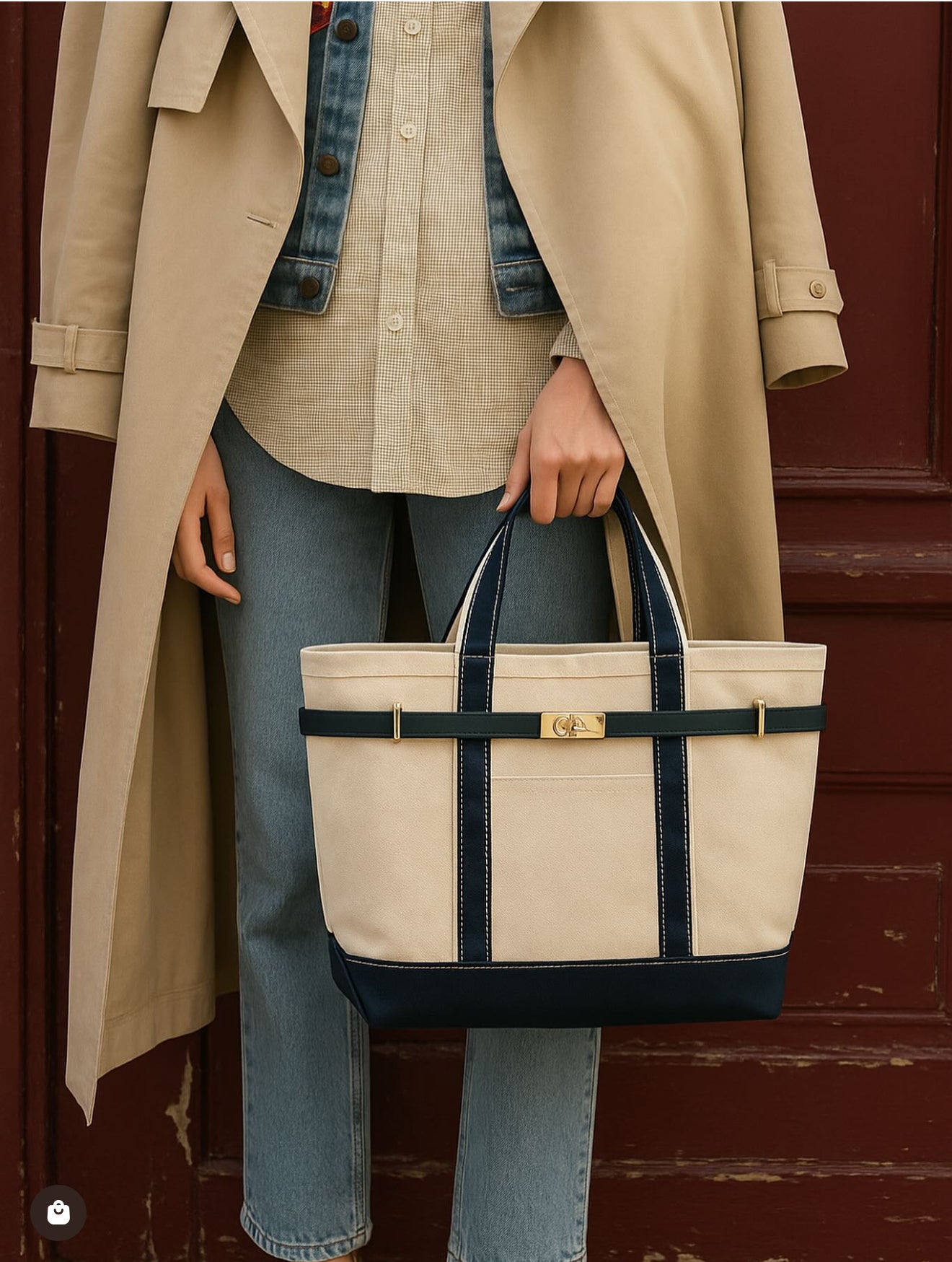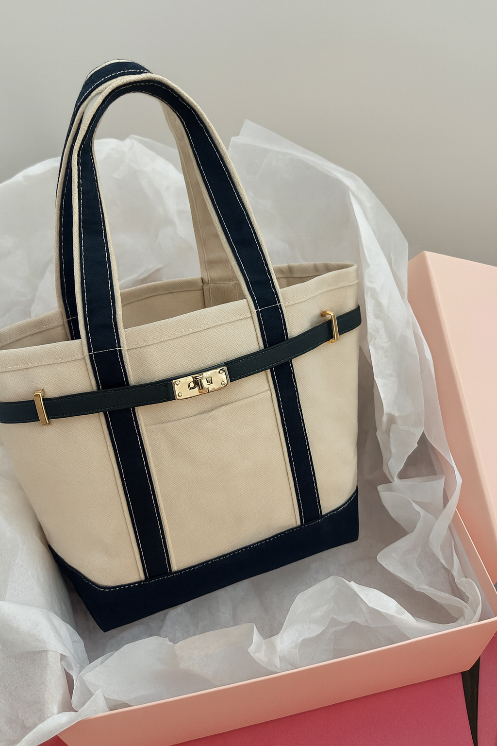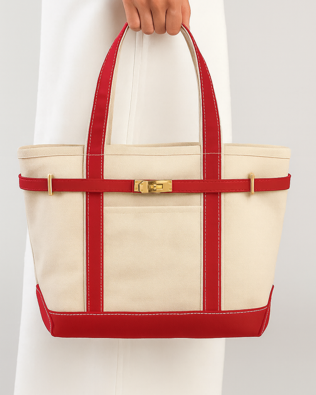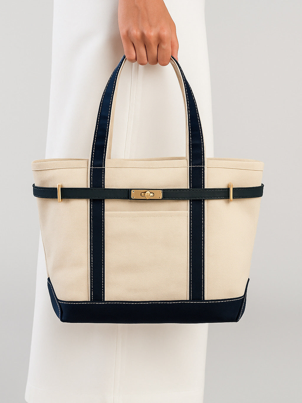 The polished turn-lock shines with a warm, mirror-like finish, striking a perfect balance between elegance and strength. Precision-cut metal hardware secures each tote with effortless ease.