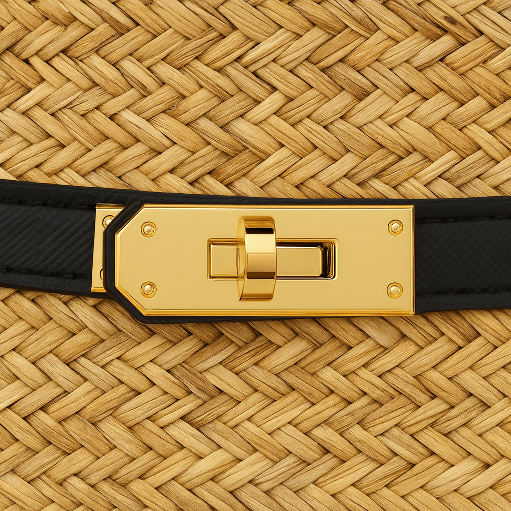The polished turn-lock shines with a warm, mirror-like finish, striking a perfect balance between elegance and strength. Precision-cut metal hardware secures each tote with effortless ease.